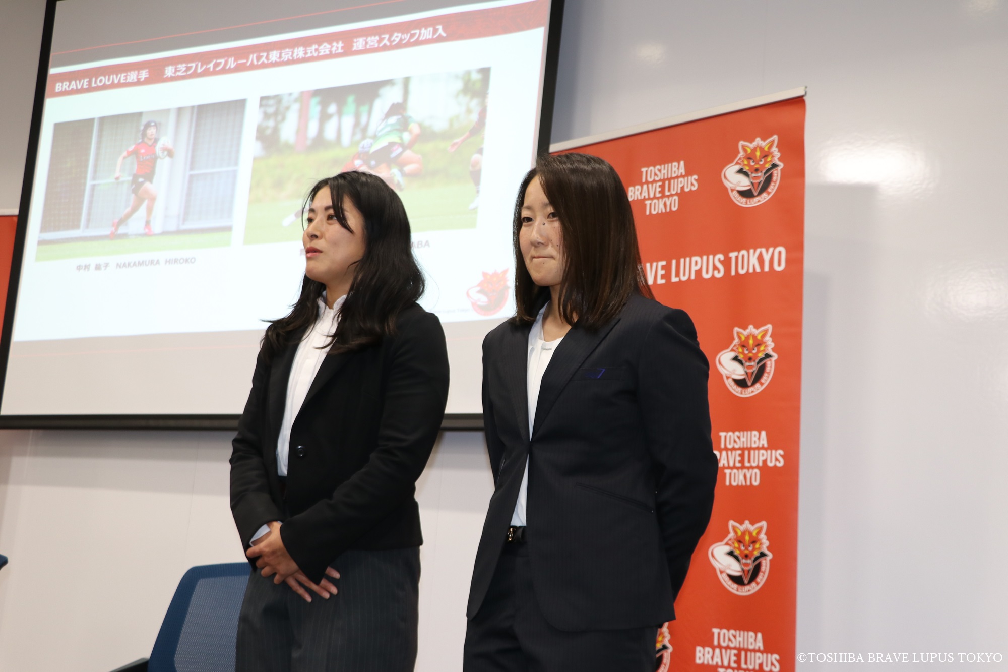 まずは新スタッフ加入の発表です。女子ラグビーチーム『Brave Louve(ブレイブルーヴ)』に所属する選手兼スタッフの中村紘子選手(写真左)、青柳双葉選手(写真右)と、11月から業務委託契約を結んでいます。