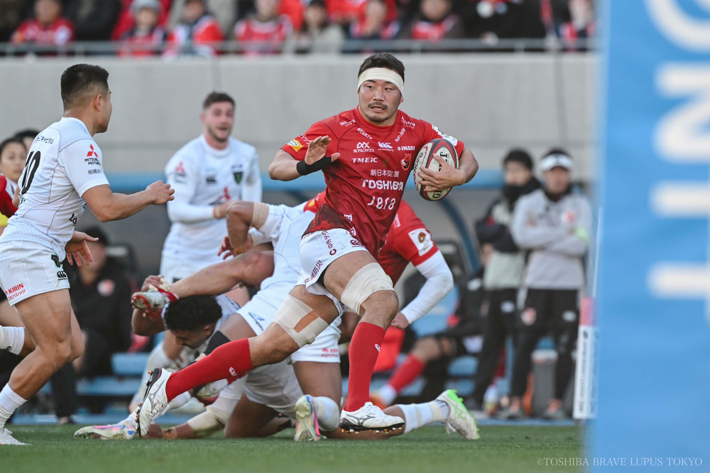 14時30分キックオフの試合は、東芝ブレイブルーパス東京のペースで進みます。3分にロブ・トンプソン選手、9分に酒木凛平選手、17分にティージェイ・クラーク選手、30分に山本浩輝選手がトライを決めます。4本のコンバージョンキックはリッチー・モウンガ選手がすべて成功させ、31分の時点で28対3と大きくリードします。