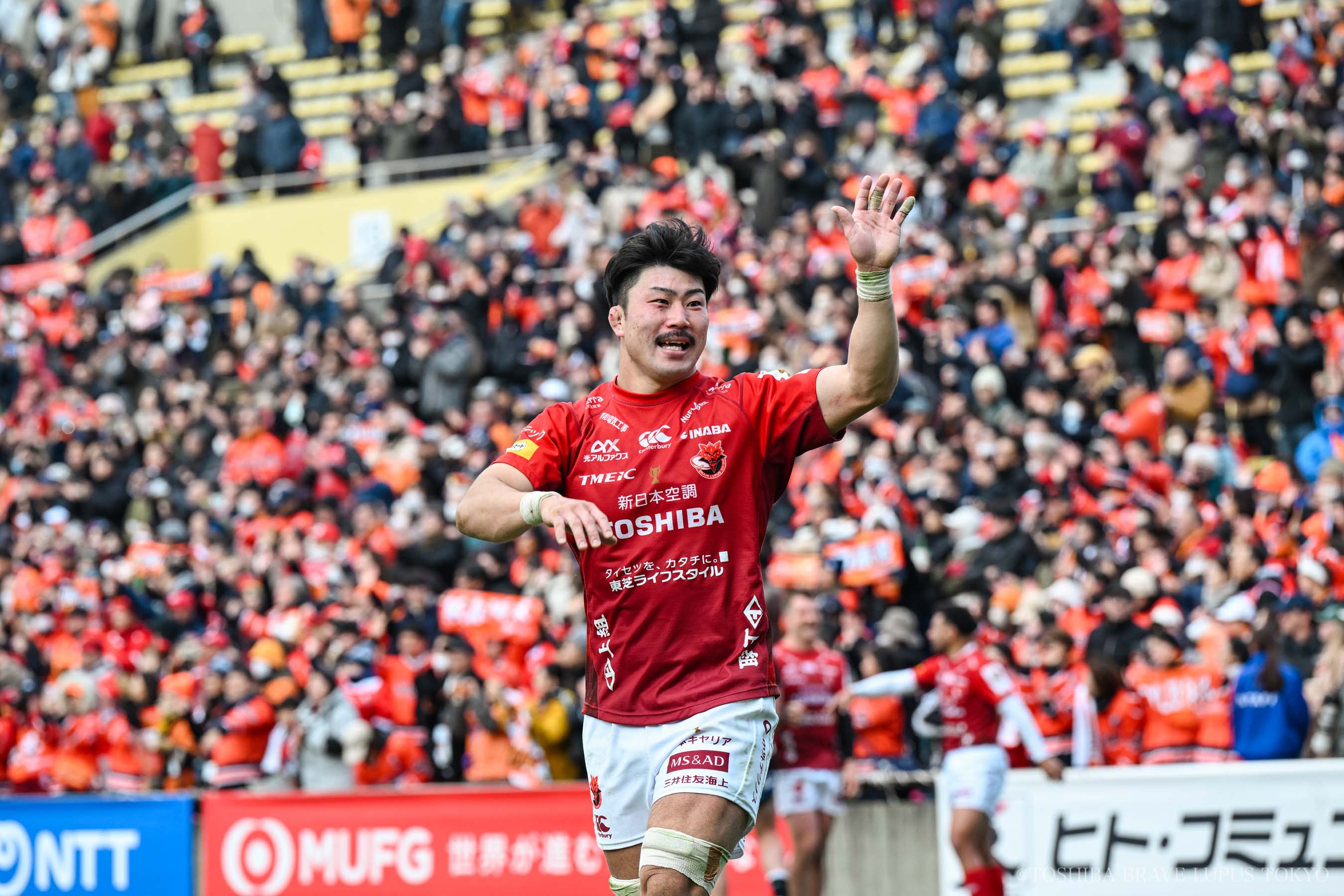 佐々木剛選手は「僕たちはアタックしたいチームで、残り少ない時間で逆転されてアタッキングマインドに火がついた」と話しました。試合の最終盤は、敵陣でアタックを継続していきます。トライライン前の攻防が繰り返され、18フェーズ目でリッチー・モウンガ選手が相手守備網をくぐり抜け、突き刺すように右手一本でグラウンディング!! ラストプレーとなるコンバージョンキックも成功させ、24対20で東芝ブレイブルーパス東京が勝利を収めました。